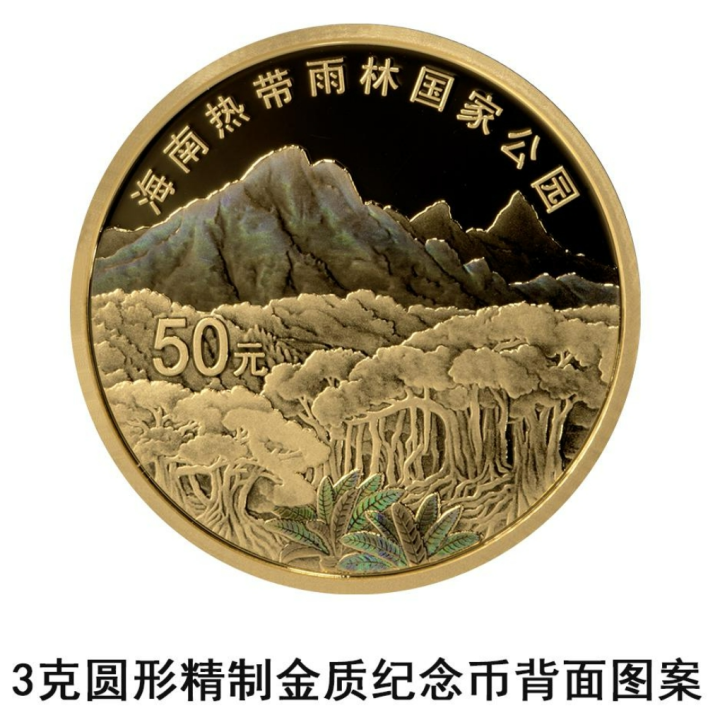 3克圆形金质纪念币背面图案为海南热带雨林国家公园自然景观,并刊“海南热带雨林国家公园”字样及面额。