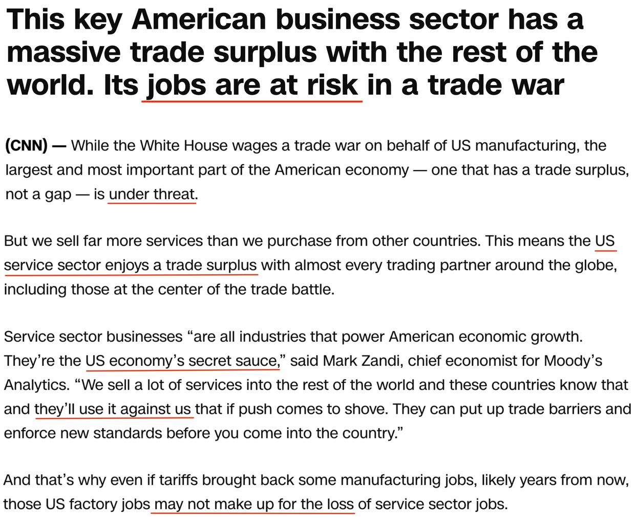 美国有线电视新闻网的文章进一步警告,如果作为美国“关键商业领域”的服务贸易对世界其他地区有巨大顺差且被拖入贸易战,美国的就业将岌岌可危。