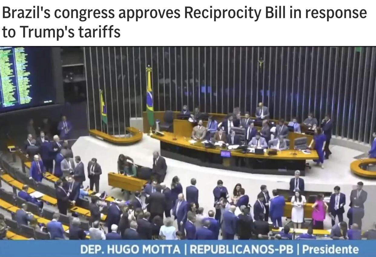 巴西国会本月就通过“经济对等法案”,规定在其他经济体单方面对巴西的国际竞争力施加负面影响的情况下,巴西外贸委员会除了可以对这些经济体出口到巴西的产品征税外,还可通过暂停商业特许权、知识产权等限制服务进口的形式进行反制。