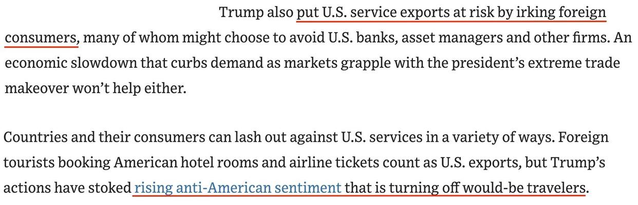 此外,美国关税政策激起的反美情绪已经且仍将导致外国游客减少赴美,而他们的酒店住宿和机票都被计入美国的服务出口。