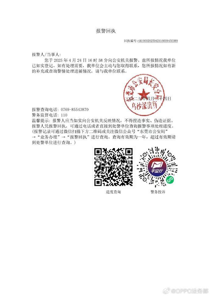 针对上述恶意不实信息,OPPO法务部已于第一时间向公安机关正式报案。目前我们已积极取证并保存相关证据,将依法追究造谣者和恶意传播者的法律责任,绝不姑息。