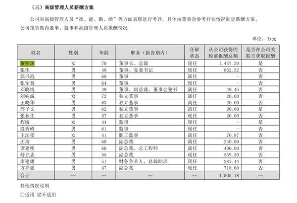中国网讯 4月28日,格力电器发布2024年年度报告,全面披露高管薪酬与公司业绩数据。其中最引人注目的,是现年70岁的董事长兼总裁董明珠——她不仅以1437.2万元的年薪稳居高管薪酬榜首,还因持股超过1亿股,预计可获得约2亿元的现金分红。
