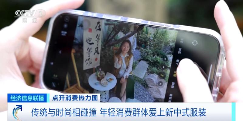 在广东佛山的一家茶馆,龙永霞正和闺蜜身穿新中式服装一起拍照打卡。她告诉记者,自己喜欢新中式服装已经五六年了,刚购买了几件新中式马甲。