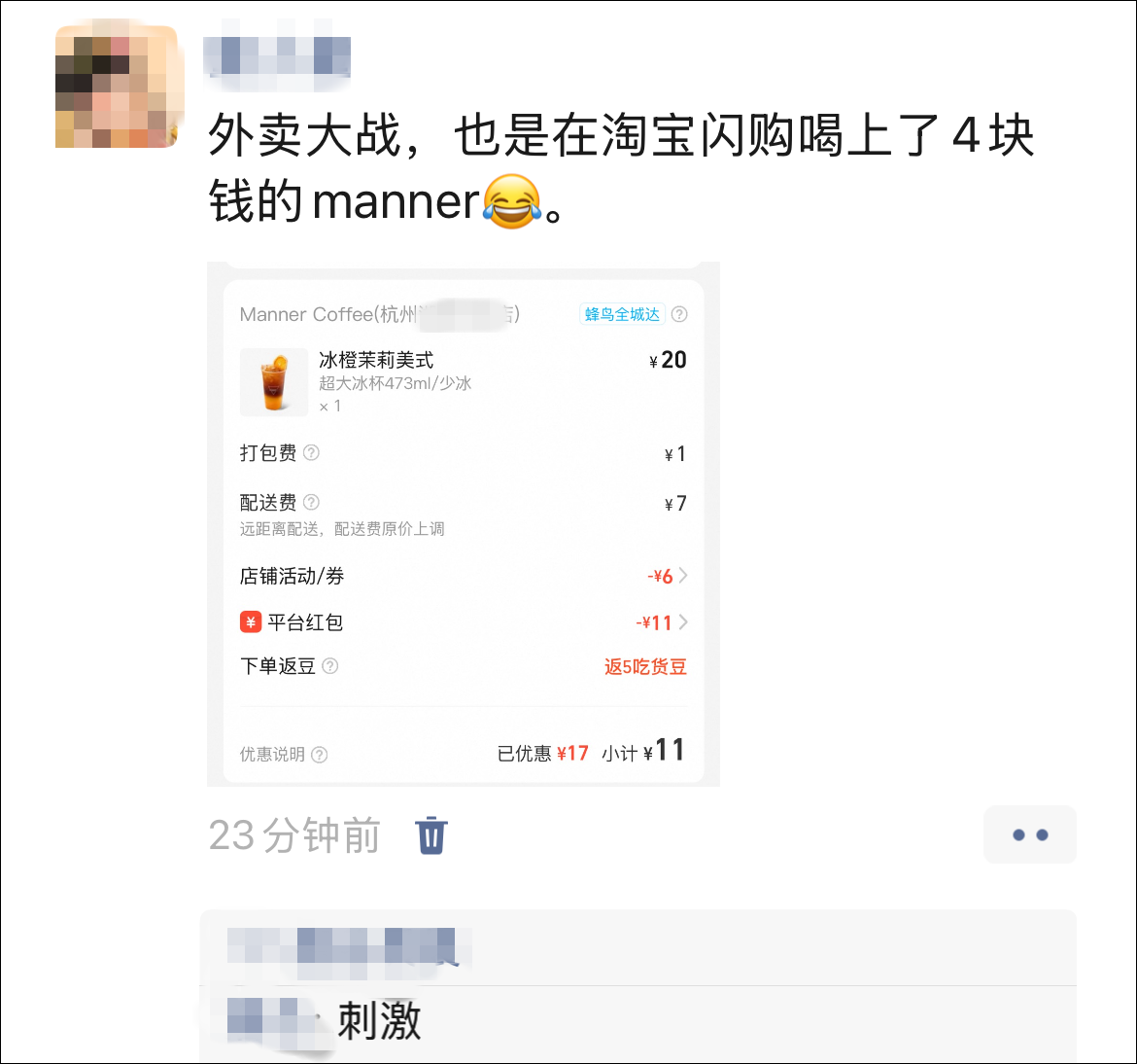 5月2日,不少网友在社交媒体晒出了订单,诸如0.1元喝上了奶茶,2元吃了一顿饭,5元吃蓝莓奇异果等。