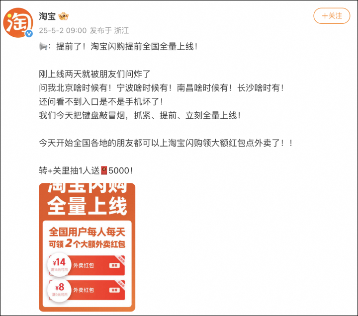 就在5月2日,淘宝官方微博宣布:淘宝闪购提前全量上线。全国用户即日起可通过淘宝“闪购”入口,领取大额红包购买外卖。