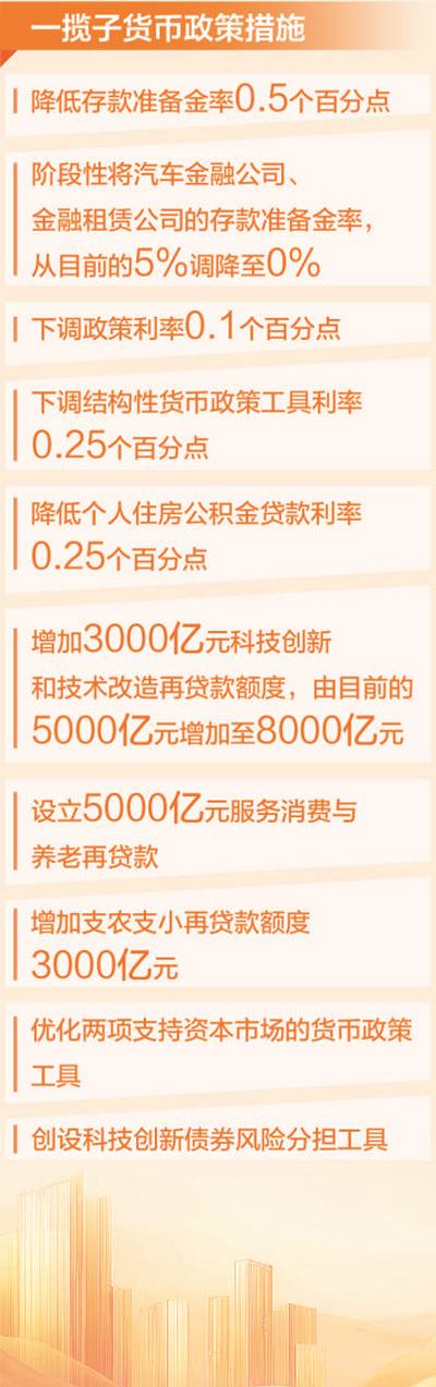 降低存款准备金率0.5个百分点,预计将向市场提供长期流动性约1万亿元;阶段性将汽车金融公司、金融租赁公司的存款准备金率从目前的5%调降为0%;下调政策利率0.1个百分点,预计将带动贷款市场报价利率(LPR)同步下行约0.1个百分点……发布会上,潘功胜宣布,为进一步实施好适度宽松的货币政策,人民银行将加大宏观调控强度,推出一揽子货币政策措施,主要有3大类共10项措施。