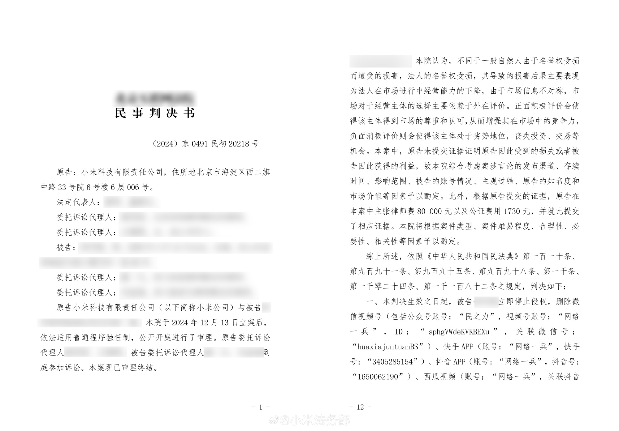 近日,就小米公司与自媒体“民之力”(又名“网络一兵”)网络侵权责任纠纷一案,法院作出一审判决。法院认定被告存在侮辱、诽谤行为,侵害了小米公司的名誉权。判令被告删除在抖音、头条、哔哩哔哩、西瓜视频、快手、微信视频号、微信公众号平台账号内发布的侵权内容,发布声明消除给小米公司造成的负面影响,并赔偿小米公司各项损失共计6万元。