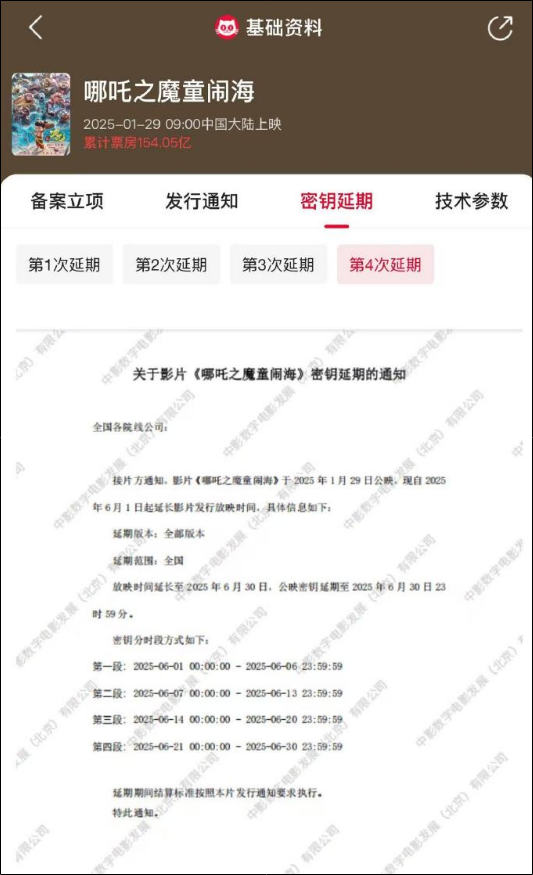 橙柿互动综合报道 今天,据猫眼专业版数据,电影《哪吒之魔童闹海》片方发布密钥延期通知,本片将从6月1日延长上映至6月30日,这已是本片第四次延期。