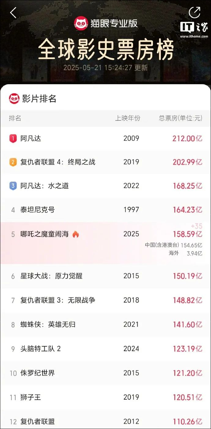 截至今天15时24分,电影《哪吒之魔童闹海》全球累计票房达 158.59 亿元(包含港澳台及海外票房3.94亿元),位居影史第五,距离全球票房第四的《泰坦尼克号》还差5.64亿元。