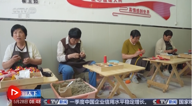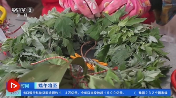 在江苏新沂的一家艾草企业直播间里,主播正热情地介绍新款艾草文创产品,线上订单源源不断。一旁的生产线上,工人们也正在熟练地制作艾草花环。端午临近,这款艾草花环日均销量突破万件。
