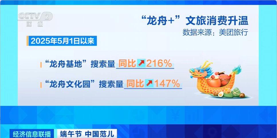 旅游平台数据显示,今年5月1日以来,“龙舟基地”搜索量同比上涨216%,“龙舟文化园”搜索量同比上涨147%,此外,端午特色传统美食“龙船饭”搜索量同比上涨183%,广州、东莞、佛山、江门、杭州、深圳等地成“龙船饭”热门搜索目的地。