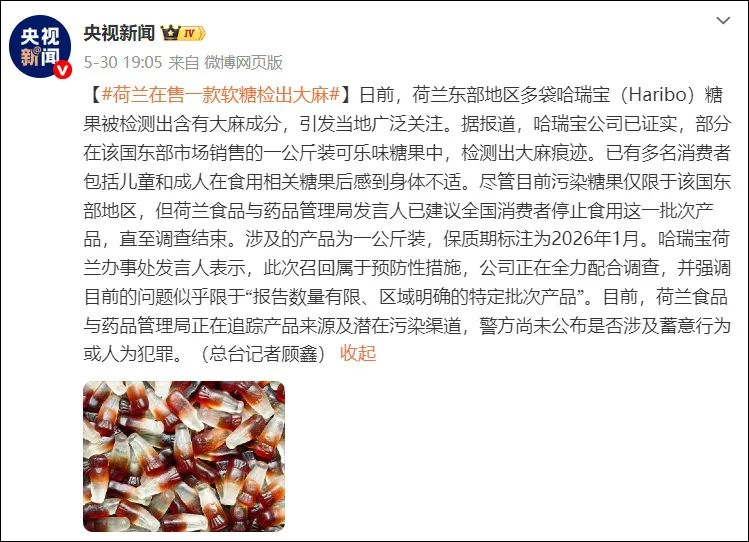 日前,荷兰东部地区多袋哈瑞宝(Haribo)糖果被检测出含有大麻成分。据央视新闻报道,哈瑞宝公司已证实,部分在该国东部市场销售的一公斤装可乐味糖果中,检测出大麻痕迹。已有多名消费者包括儿童和成人在食用相关糖果后感到身体不适。尽管目前污染糖果仅限于该国东部地区,但荷兰食品与药品管理局发言人已建议全国消费者停止食用这一批次产品,直至调查结束。涉及的产品为一公斤装,保质期标注为2026年1月。哈瑞宝荷兰办事处发言人表示,此次召回属于预防性措施,公司正在全力配合调查,并强调目前的问题似乎限于“报告数量有限、区域明确的特定批次产品”。目前,荷兰食品与药品管理局正在追踪产品来源及潜在污染渠道,警方尚未公布是否涉及蓄意行为或人为犯罪。