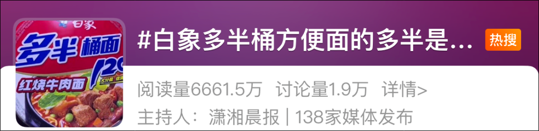 近日,有多位网友发帖称,白象“多半袋面”系列产品背后包装上显示,“多半”是白象食品股份有限公司的注册商标,相关话题迅速冲上热搜。