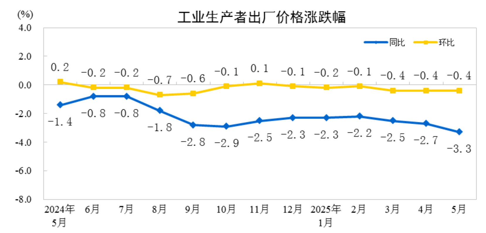 央视网消息:据国家统计局网站消息,2025年5月份,全国工业生产者出厂价格同比下降3.3%,环比下降0.4%;工业生产者购进价格同比下降3.6%,环比下降0.6%。1—5月平均,工业生产者出厂价格和购进价格比上年同期均下降2.6%。