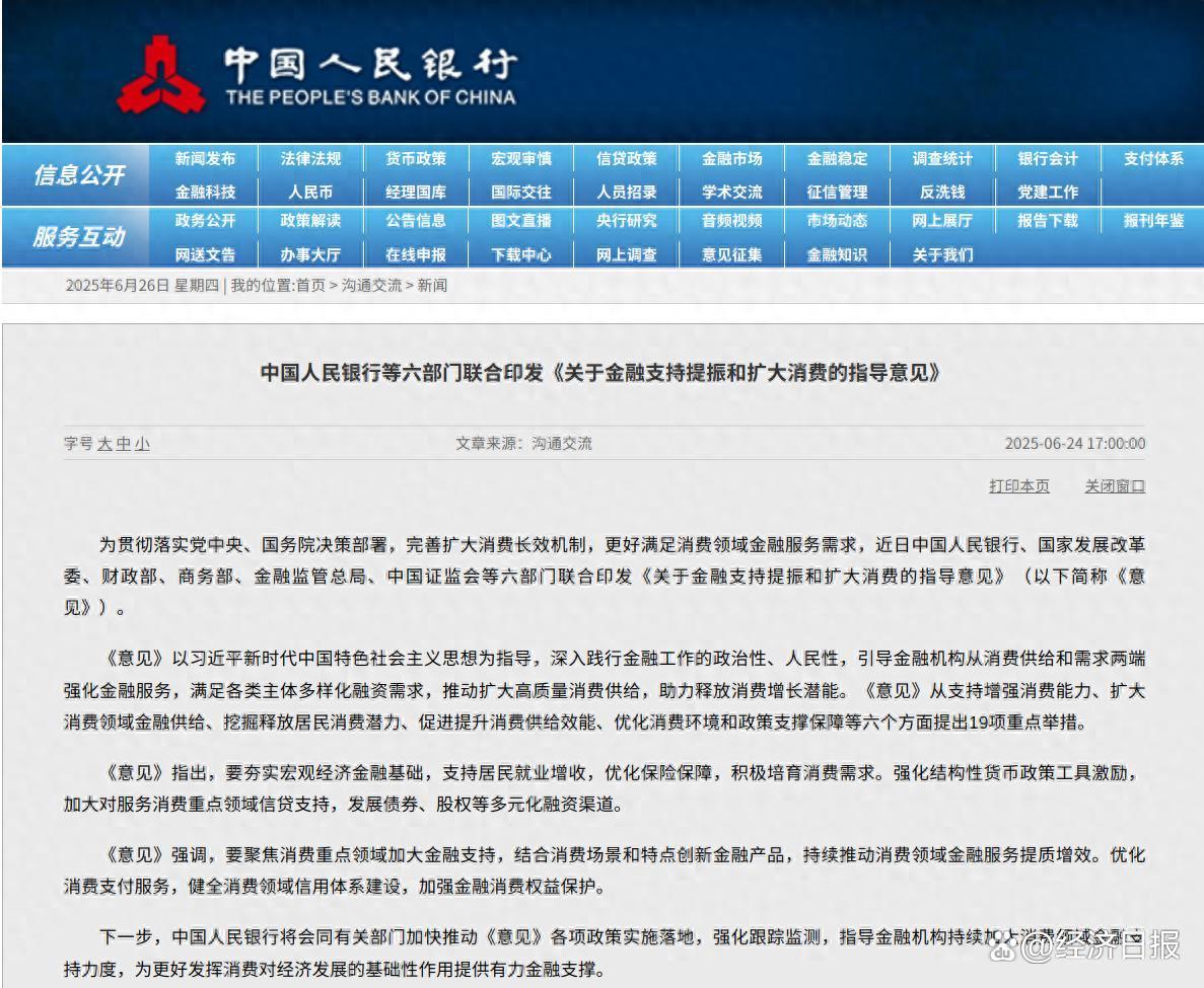 经济日报讯 近日,中国人民银行等六部门联合发布《关于金融支持提振和扩大消费的指导意见》,为金融更好支持消费增长划出了重点、指明了方向。