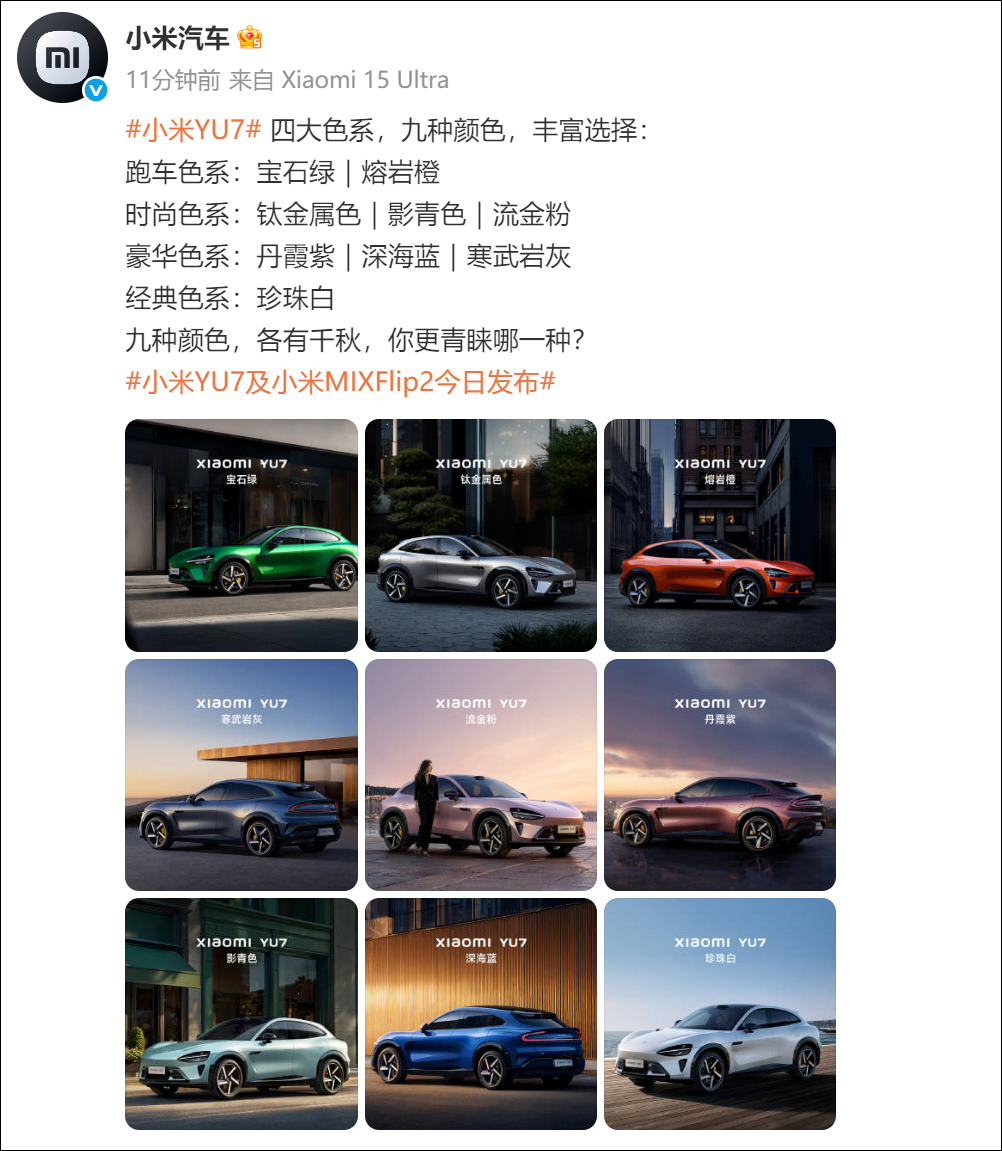 小米YU7共4大色系,9款颜色: