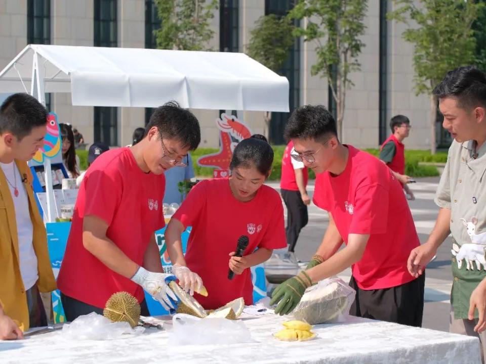 海南三亚优旗榴莲科技小院的同学们正在介绍国产树上自然成熟的榴莲。 王心悦 摄