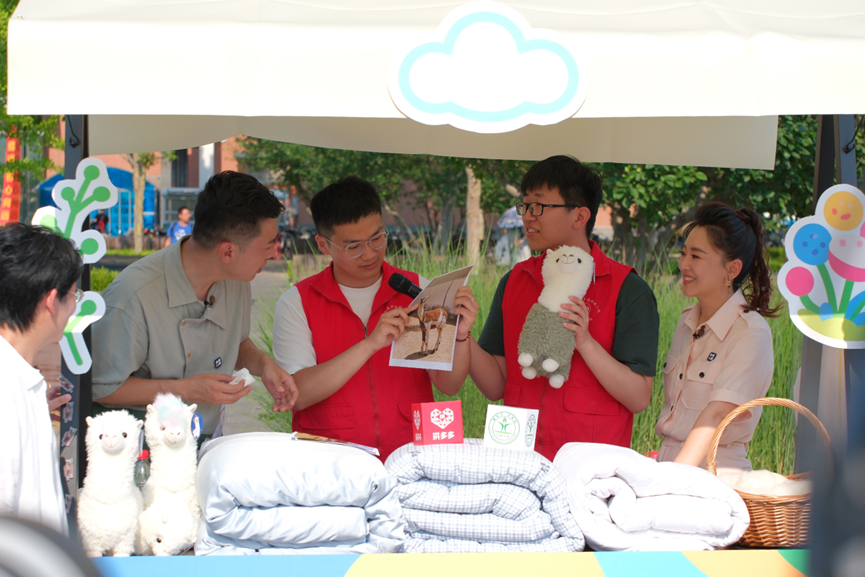 北京延庆羊驼科技小院的同学们带着羊驼绒被、羊驼文创参加毕业市集。王心悦 摄