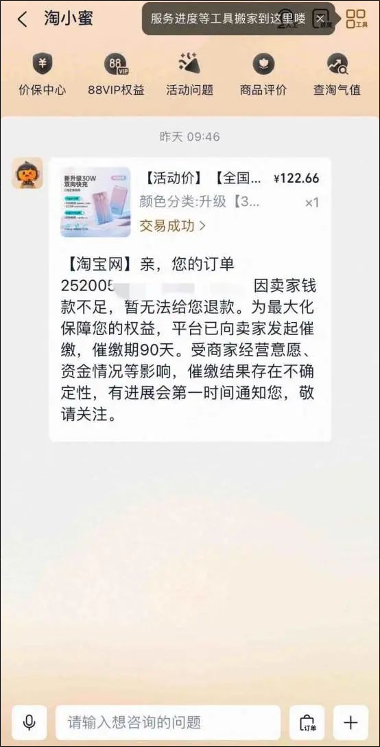 据九派新闻,有消费者称,其订单退款流程已卡顿数十天,联系商家也没获得回应,“淘宝客服的回复是卖家钱款不足,暂无法退款,他们正在催缴保证金”。