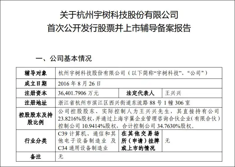 辅导备案报告显示,宇树科技控股股东、实际控制人为王兴兴,王兴兴直接持有公司23.8216%股权,并通过上海宇翼企业管理咨询合伙企业(有限合伙)控制公司10.9414%股权,合计控制公司34.7630%股权。