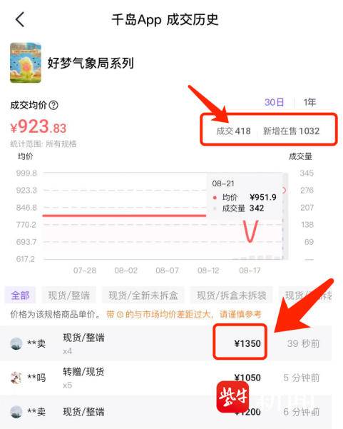 记者注意到,此次上新的“星星人好梦气象局系列”(下称星星人)IP备受市场追捧。由于现货一盒难求,盲盒在二手市场上价格迅速飙升。例如在千岛APP上,星星人22日最新整盒成交价达到1350元,溢价约3倍,单个平均价约150元,溢价约2倍,隐藏款价格高达478元,溢价更是超过6倍。有人直呼“这么贵到底是谁在买”“简直比黄金还离谱”。