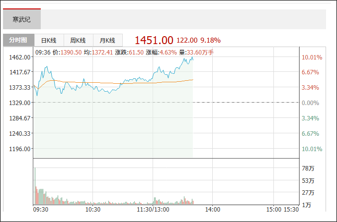 寒武纪股价超越贵州茅台(600519),晋升A股“股王”,最高报1463元/股,年内涨幅超120%。