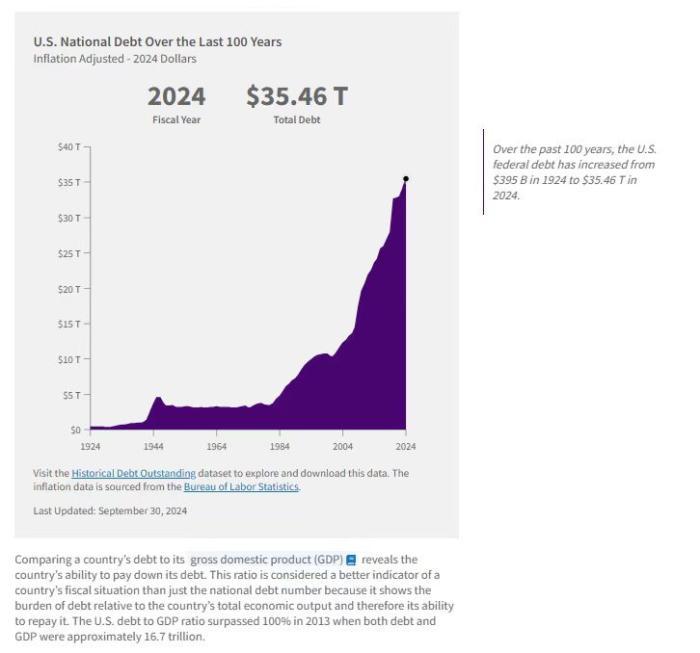 根据美国政府公开的数据,自2008年起美债规模就保持着惊人的扩张速度,2017年突破20万亿美元,2024年突破35万亿,最近一年间又快速飙升至37万亿。这一数额相当于2024年美国名义国内生产总值的1.27倍,折合到人均,相当于每个美国人要背负约10.7万美元的债务。