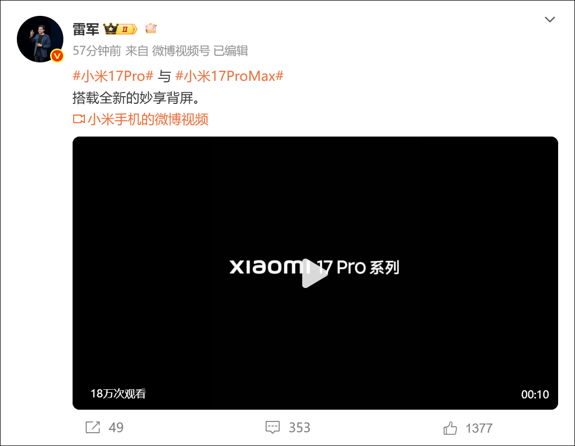 昨天,小米手机也曾发视频预告17pro的背屏设计,小米集团总裁卢伟冰表示:小米17Pro系列的首次亮相,大家觉得怎么样? 不止是全新的背屏,小米17系列跨代升级,就是想给手机行业带来点“新东西”。