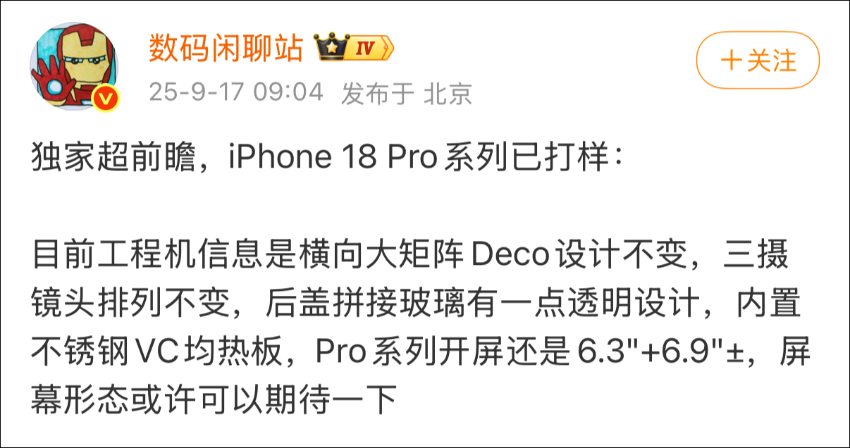 据新浪科技,博主@数码闲聊站 今天在微博透露了苹果 iPhone 18 Pro 系列手机的超前瞻消息。博主表示,iPhone 18 Pro 系列手机已经开始打样,目前工程机在大体设计上保持不变,维持横向大矩阵后置镜头模组,三摄镜头排列也与 17 Pro 系列一样,后盖拼接玻璃有一点透明设计,内置不锈钢 VC 均热板,Pro 系列开屏还是 6.3"、6.9" 左右,屏幕形态“或许可以期待一下”。