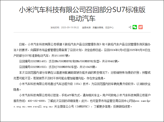 日前,小米汽车科技有限公司根据《缺陷汽车产品召回管理条例》和《缺陷汽车产品召回管理条例实施办法》的要求,向国家市场监督管理总局备案了召回计划。决定自即日起,召回2024年2月6日至2025年8月30日生产的部分SU7标准版电动汽车,共计116887辆。