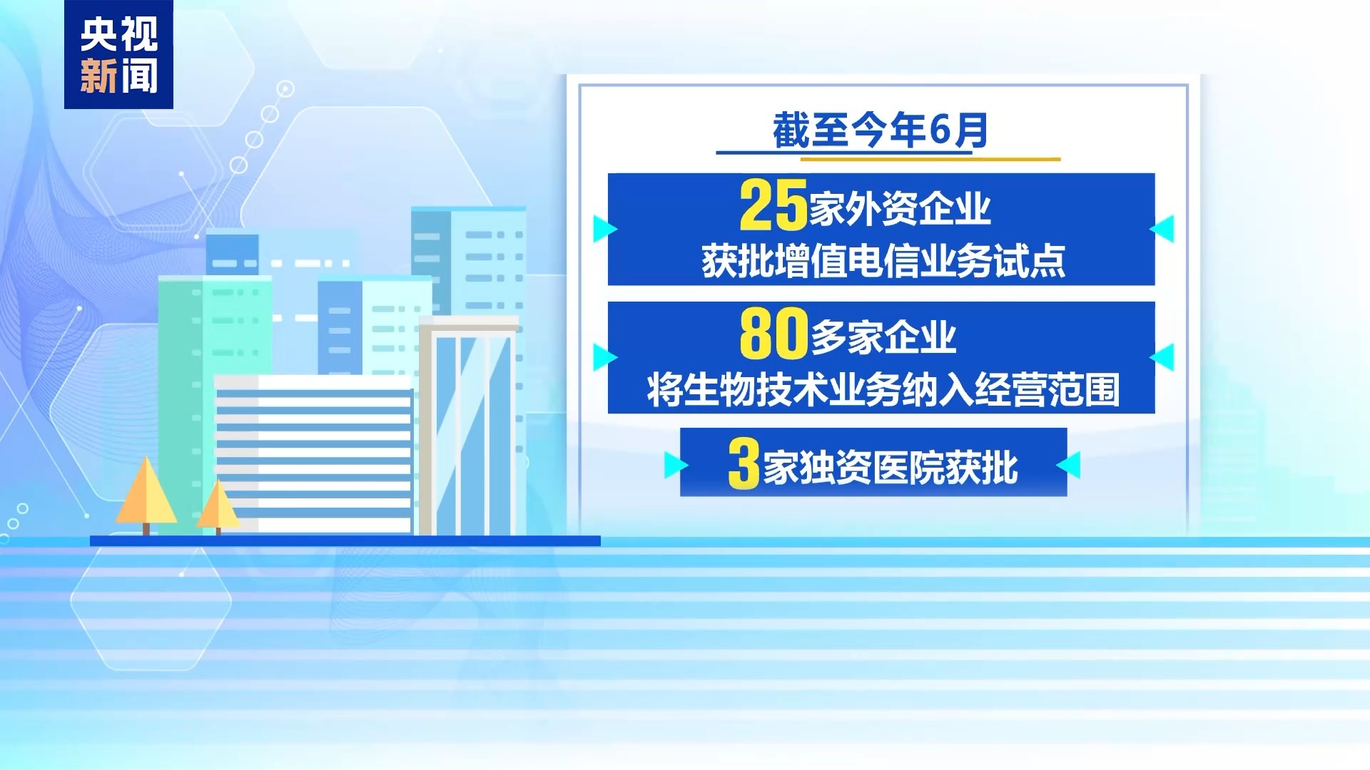 截至今年6月,25家外资企业获批增值电信业务试点,80多家企业将生物技术业务纳入经营范围,3家独资医院获批。