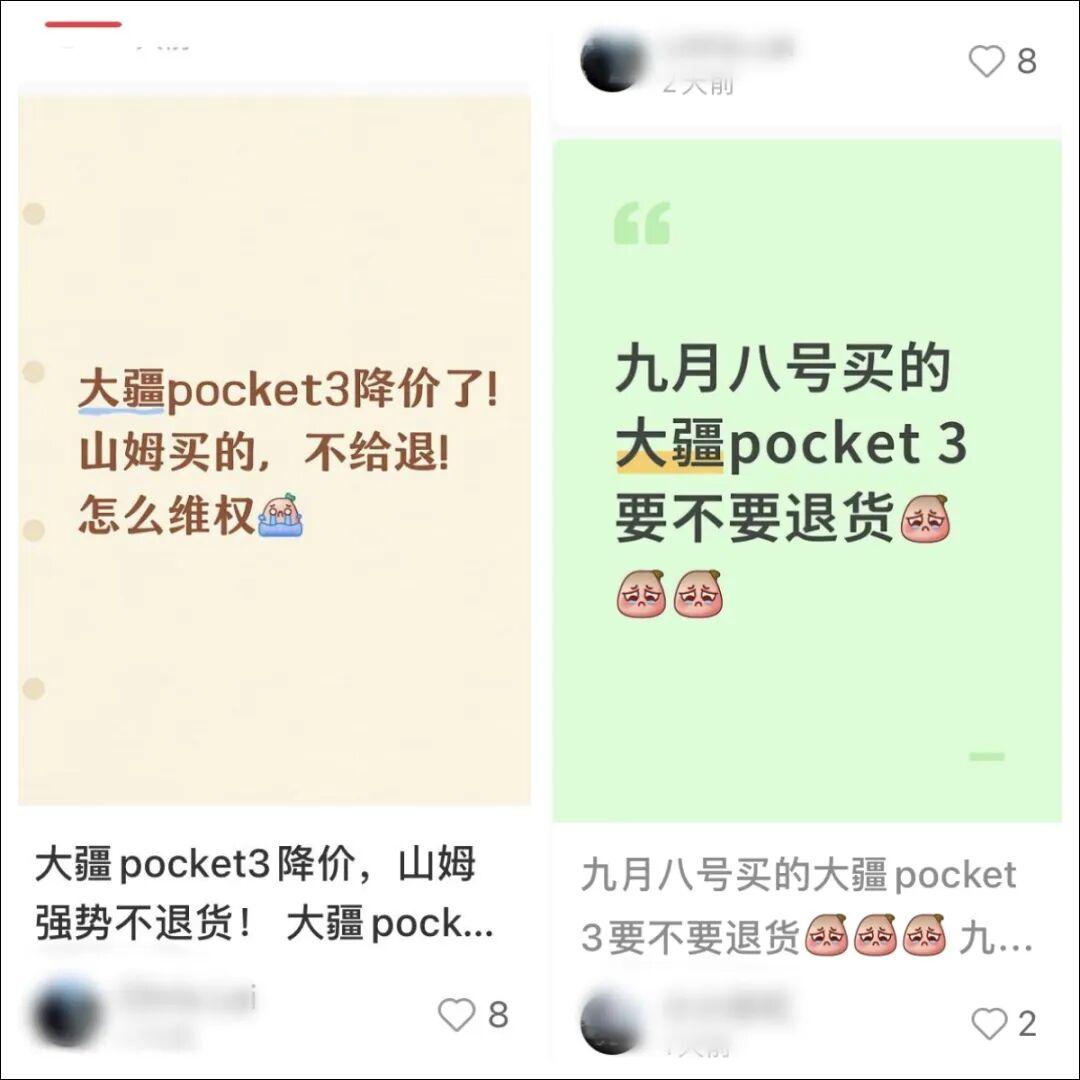 在小红书等社交媒体上检索“大疆”,可发现许多刚刚购买了大疆的消费者正在进行维权,线上、线下沟通退差价或者退货退款。许多成功退货的消费者还在笔记中分享了自己的维权经验。
