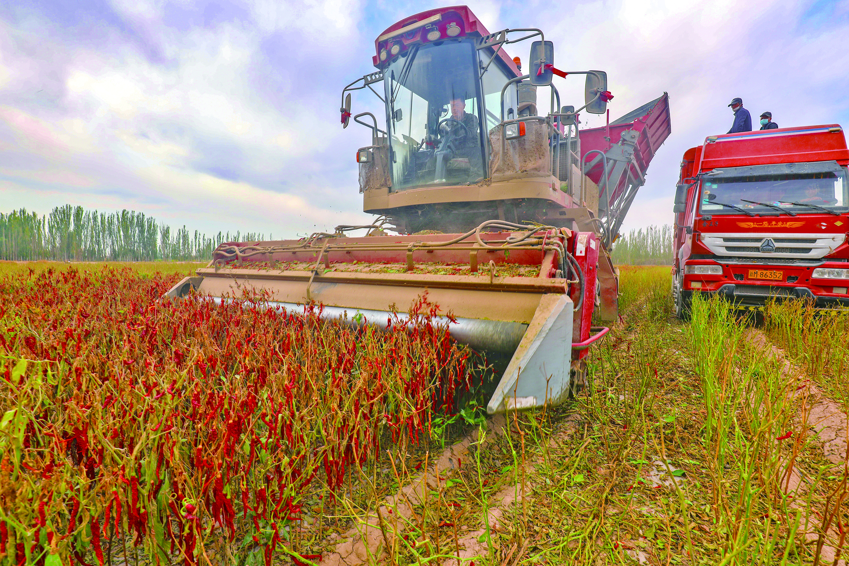 10月13日,在库车市伊西哈拉镇的线椒种植基地,一台台收割机正有序地进行线椒采收作业,红色的线椒与现代化的机械构成了一幅动人的秋收画卷。