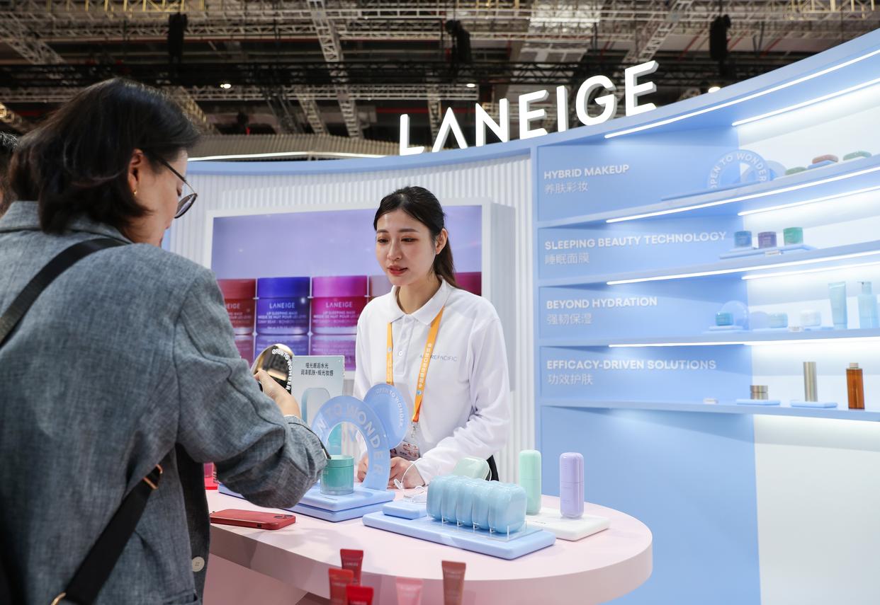 11月7日,在消费品展区的韩国爱茉莉太平洋集团展区,工作人员为参观者介绍产品。爱茉莉太平洋是进博会八届“全勤生”。新华社记者 王婧嫱 摄