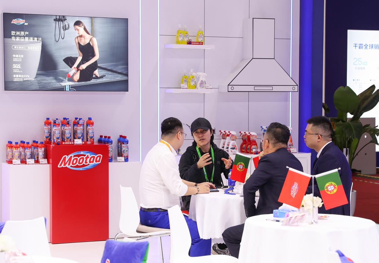11月7日,在消费品展区的葡萄牙家居清洁品牌茉汰展台,人们在进行业务洽谈。茉汰是进博会八届“全勤生”。新华社记者 王婧嫱 摄