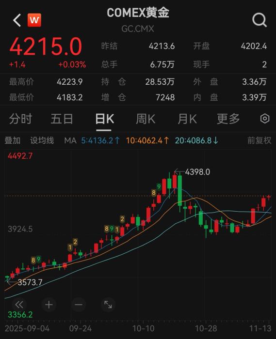 当地时间11月12日,国际金价连续第4个交易日上涨,在重回4100美元两天后,再次突破4200美元关口。COMEX黄金涨2.07%,报4201.4美元/盎司;伦敦现货黄金突破4200美元关口后回落,收报4194.605美元/盎司,涨1.68%。11月13日,国际金价盘中再次波动,截至15时,仍站稳4200美元上方。