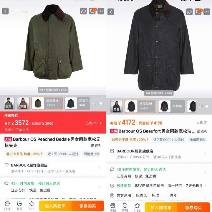 在Barbour天猫旗舰店,两款经典夹克正以“分裂画风”走红:4172元的OS Beaufort油蜡款主打“知识分子风”标签圈粉,近7天9000+人蹲守、已售31件,油蜡面料自带的复古痕迹,是它“英伦质感”的底气;3572元的Peached Bedale无蜡款则贴上“复古爷爷风”标签,成热销爆款,已售300+,两款均收获近90天4000+回头客,一边是高价“乡村外套”的定位,一边是时尚圈的热度飙升,恰是它“土潮矛盾体”的走红密码。