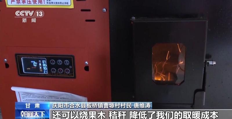 庆阳市合水县板桥镇曹塬村村民 唐维涛:这个生物质炉子很方便,把生物质颗粒加进去,全程不用人管,还可以烧果木、秸秆,降低了我们的取暖成本。