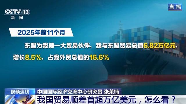 12月8日,海关总署公布了今年前11个月的外贸数据,我国贸易顺差首次超1万亿美元。民营企业成为外贸稳定增长的核心支柱,占我国外贸总值的57.1%。