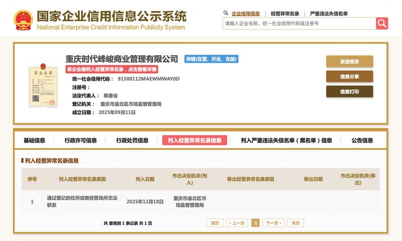 中新网12月23日电(吴家驹)国家企业信用信息公示系统显示,近日,重庆时代峰峻商业管理有限公司因通过登记的住所或者经营场所无法联系,被重庆市渝北区市场监督管理局列入经营异常名录。