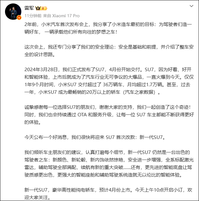 今天一早,雷军在其个人微博发文表示,今天公布一个好消息,我们很快将迎来SU7首次改款:新一代SU7。