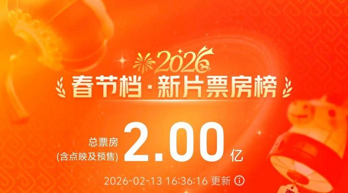 央视新闻讯 据网络平台数据,截至2月13日16时36分,2026春节档新片预售总票房突破2亿!