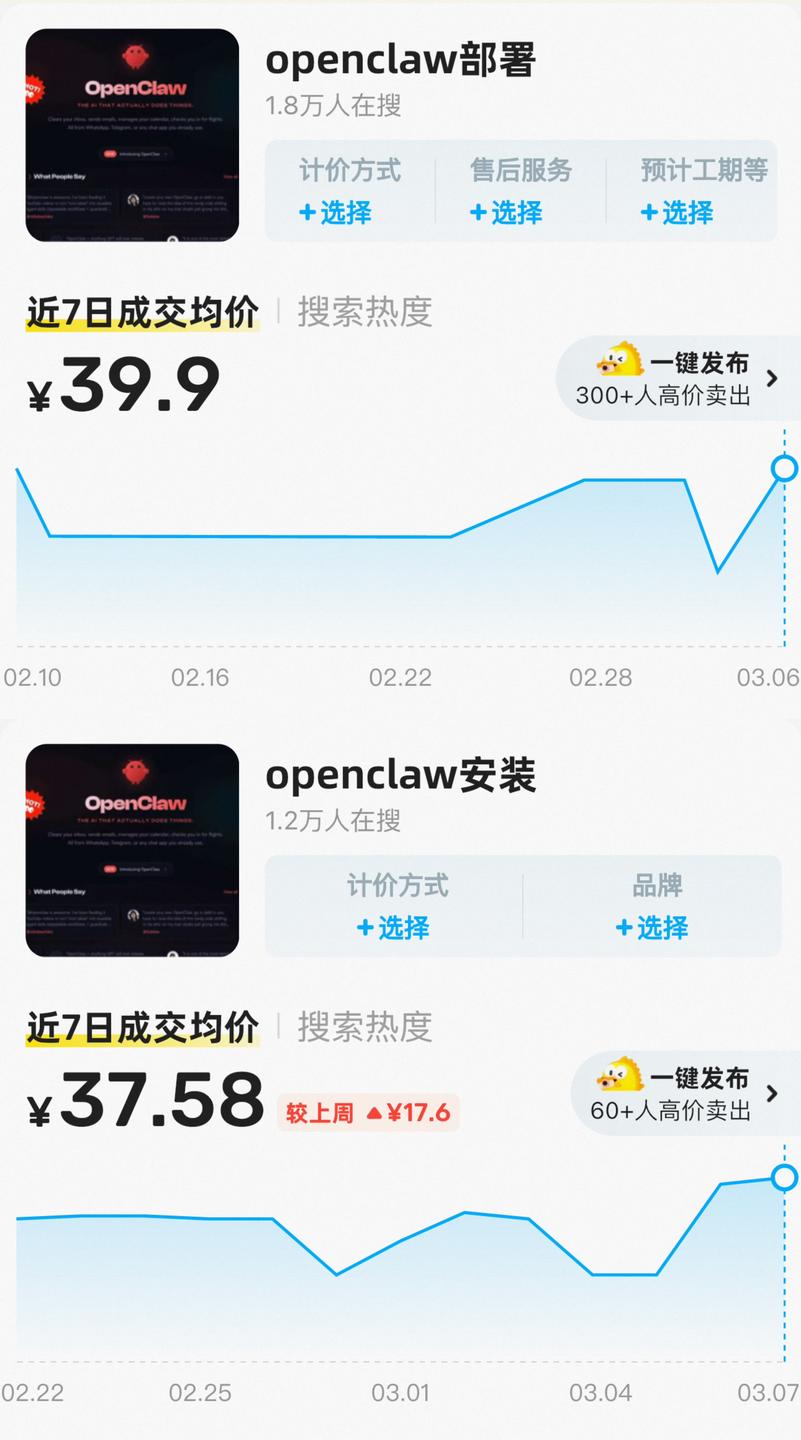 同日,某交易平台行情显示,“OpenClaw部署”近7日成交均价为39.9元,“OpenClaw安装”近7日成交均价为37.58元。