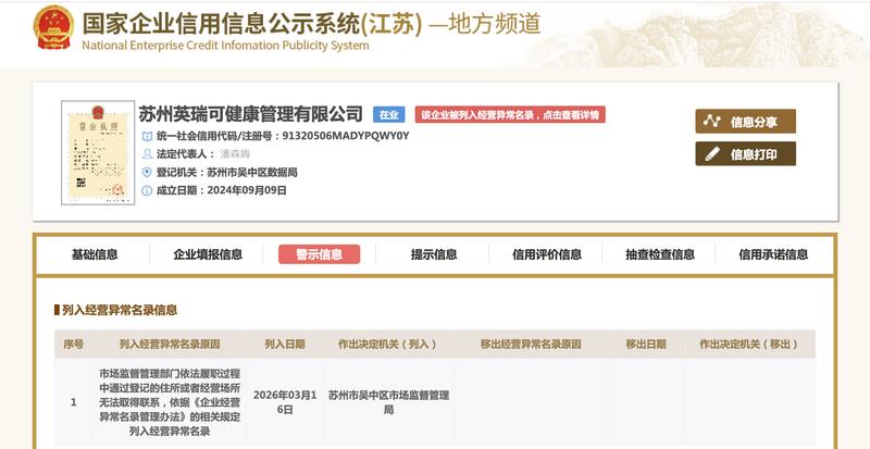 国家企业信用信息公示系统(江苏)显示,3月16日,苏州英瑞可健康管理有限公司,因市场监督管理部门依法履职过程中通过登记的住所或者经营场所无法取得联系,被苏州市吴中区市场监督管理局列入经营异常名录。