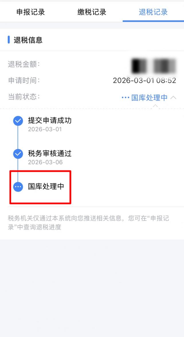 “国库处理中”表示税务机关已审核通过,并将您的退税申请提交国库,国库正在按规定处理中,请耐心等待。处理完成后,税款将由国库退至您填写的银行账户。