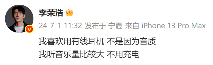 李荣浩也曾在微博中分享,称自己喜欢用有线耳机,不用充电。