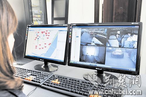 在指挥中心,记者看到电脑屏幕上显示,武汉地图有206个红点在移动。“这代表此时正有206辆运钞车在执行押运任务。”李享华介绍。工作人员点开一辆正在永清街上行驶的运钞车对应的红点,立即显示出四个画面,车前、车厢、车后、驾驶室的情况一目了然。