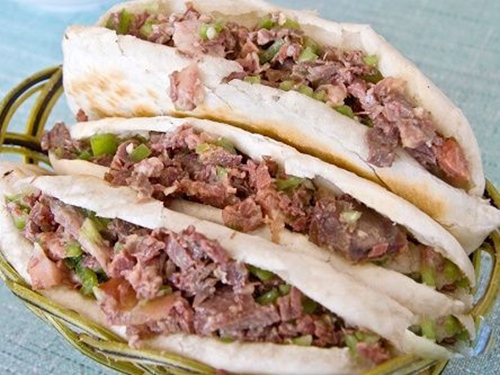 肉夹馍是古汉语“肉夹于馍”的简称,陕西省特色食物之一。在肉夹馍中,以陕西地区的“腊汁肉夹馍”(猪肉)和宁夏地区的“羊肉肉夹馍”最出名。腊汁肉夹馍是陕西省著名西府(宝鸡市)小吃和西安市著名小吃。宁夏的肉夹馍为羊肉馅,每个摊前摆有炉子,和西北其他地方的馍没有区别。