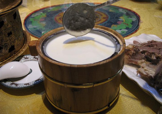 奶茶的制作过程是先从茶砖上用刀把茶叶捣碎裂,放入热水锅中煮沸,然后用布袋将乏茶叶捞出,茶水置于桶内。将小米在锅内炒至散发出香味。再将桶内茶水和鲜牛奶倒入锅煮沸,并用勺反复扬晾,待茶郛交融后即可饮用。