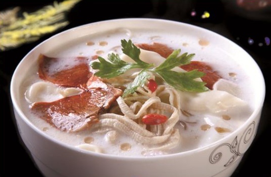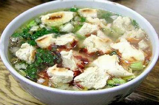 羊肉泡馍,亦称牛羊肉泡馍,古称"羊羹"。西北回族风味美馔,尤以陕西西安最享牛羊肉泡馍盛名,北宋著名诗人苏轼留有"陇馔有熊腊,秦烹唯羊羹"的诗句。它烹制精细,料重味醇,肉烂汤浓,肥而不腻,营养丰富,香气四溢,诱人食欲,食后回味无穷。因它暖胃耐饥,素为西安和西北地区各族人民所喜爱,外宾来陕也争先品尝,以饱口福。
